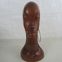 African Hand Carved Wood Folkart Tribal Woman Bust Signed 16" Tall