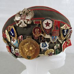 Soviet Union Russian Military Vtg. Garrison Hat w 31 Pins & 3 Patches