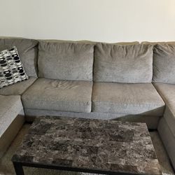 Gray wood dining table and chairs/Blue leather sectional/ glass coffee table still available as of 10/8/2025$500Mason Neck, Virginia