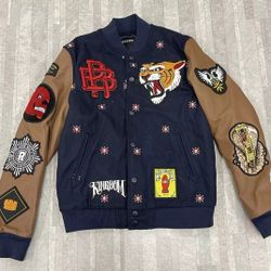 Reason Varsity Jacket Mens M Blue Tiger Patches Snap Pleather Sleeves$75Sterling, VA