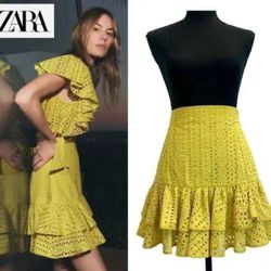 ZARA Yellow Ruffle Skirt High Waist Cut Out Embroidered Summer Size S $30Friendly, MD