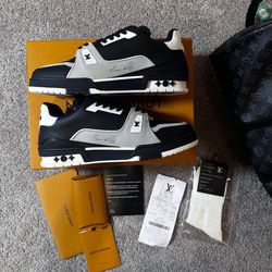 the Louis Vuitton LV Trainer sneakers in a Black, Grey, and White colorway. This iconic model was designed by Virgil Abloh and is inspired by vintage $350Friendly, MD