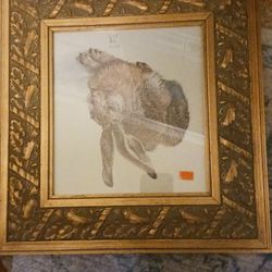 Framed vintage rabbit art print in ornate gold frame.