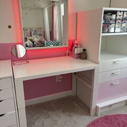 S13🔥Vanity Set with Rectangular Mirror, Makeup Vanity Dressing Table with 5 Drawers, Shelves, Dresser Desk and Cushioned Stool Set (B White/Lighted M$110Columbia, MD