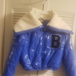 Glammy B varsity jacket in blue with a white sherpa-lined collar.