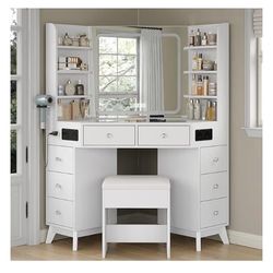 Corner Vanity Desk with Buil-in Speaker, 8 Drawers & 6 Shelves, Makeup Vanity with Glass Top, Modern Vanity with Mirror and Lights, 3 Color Lighting M$200Sterling Heights, MI