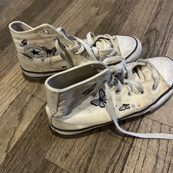 Converse Chuck Taylor All Star "Butterflies" High Top Sneakers in an off-white/egret colorway. They feature embroidered butterfly and floral graphics $25Redford Charter Township, MI