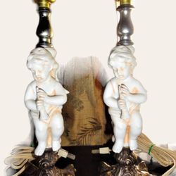 Vintage Set Of 2 Mid Century Porcelain Bisque Cherubs With A Flute Made In Italy Brass Ornate Metal Base Table Lamps$95Holland, MI