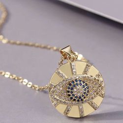 GOLD BLUE ROUND PAVE CRYSTAL DISC NECKLACE EVIL EYE$12Macomb, MI