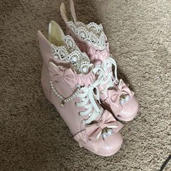 Cute Lolita Boots Chunky Mid Heel Ankle Boots with Bow Platform Lace Up Booties with Pearl$40Allegan, MI