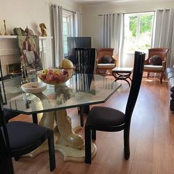 Leather wrapped coffee table , all wood with metal accents. 2 glass top wood with metal accents. Excellent condition. Will sell separately. l $150Newport, MI