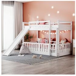Twin Over Twin Floor Bunk Bed with Slide and Ladder, Low Bunk Bed for Kids, Girls, Boys, Removable Fence, White with Fence$250Sterling Heights, MI