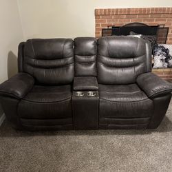 Moving Sale ❗️❗️❗️ Burgundy red latter Living room furniture include :reclining sofa, loveseat and chair, coffee table , end table and two floor light$650Saint Anthony, MN