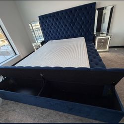 Blue Velvet King Bed Frame with Storage + 2 Mirrored Nightstands$1,050Bloomington, MN