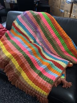 Hand crochet wool throw in stripe pattern 40 in x 80 in with fringe ends$20Columbia, MO