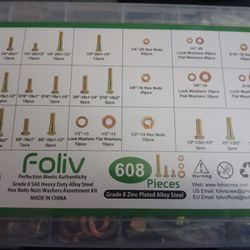 FOLIV 608 Pieces Grade 8 Zinc Plated Alloy Steel Hex Bolts Nuts Washers Assortment Kit$45Independence, MO