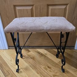 70s Vintage Spanish Style Black Scrolled Metal Bench With Pink Jacquard Weave Matelassé Fabric$30Peculiar, MO