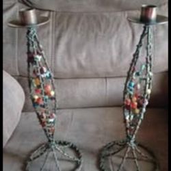 Set (2) Pillar Pedestal Candle Holders Metal Wrought Iron Wire Glass Beads$15Kansas City, MO