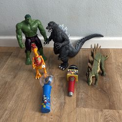 Incredible Hulk, Godzilla, Imaginex Dino, Dinosaur train conductor, and Micky Mouse toys$15Maryville, IL
