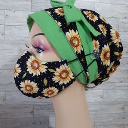 Sunflower Surgical Scrub Hat Set Reversible Ponytail Style Doctor Nurse Chemo Chef Cotton Bouffant Head Wrap With Buttons $17Gautier, MS