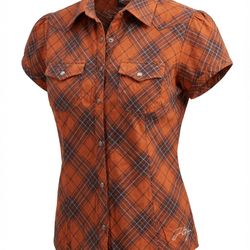 Harley-Davidson Woman Orange Plaid Snap Buttons Size XS P2P 19”$40Davidson, NC