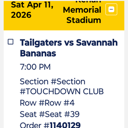 Savannah banana v/s tailgaters 3/11 Sat. 3:00pm$750Chapel Hill, NC