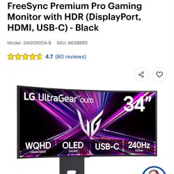 LG - UltraGear 34" OLED Curved WQHD 240Hz 0.03ms AMD FreeSync Premium Pro Gaming Monitor with HDR (DisplayPort, HDMI, USB-C) - Black$750Morrisville, NC