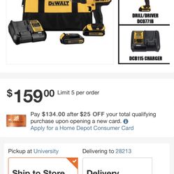 DEWALT ATOMIC 20-Volt MAX Cordless Brushless Compact Drill/Impact Combo Kit (2-Tool) with (2) 1.3Ah Batteries, Charger & Bag$129Charlotte, NC