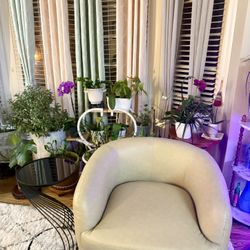 Brand New Upholstered Cream Faux Leather Swivel Barrel Chair Recessed Arms With Solid Wood Base And Black Side Table $250Charlotte, NC