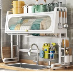 Over The Sink Dish Drying Rack 3 Tier Large Kitchen Sink Shlef Dish Rack Over The Counter Metal Dish Drying Rack Adjustable (28.34"-31.49") (White)