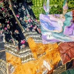New Gallia Floral Kimono, Purple Marble Tote, and Coconut Wood & Green Glass Bead Dangle Earrings $25$25Greensboro, NC