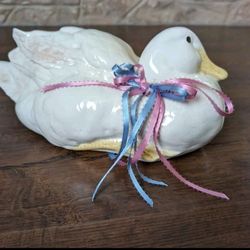 cream-colored duck figurine, 13 in, decorated with pink and blue ribbons$10Philadelphia, PA