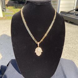 Gold Chain Cuban Link Necklace 20in 7mm And Icy Hamsa Hand Pendant Set $50Haddon Heights, NJ