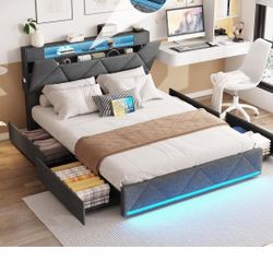 Rolanstar Bed Frame Full Size with Charging Station and LED Lights, Upholstered Storage Headboard with Drawers, Heavy Duty Metal Slats, No Box Spring $130Camden, NJ