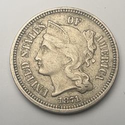 1871 Liberty Head Three-Cent Nickel Coin$40Philadelphia, PA