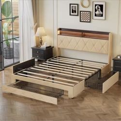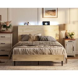 Queen Bed Frame With Ergonomic Headboard & Storage Shelf, Wood Platform Bed Frame with Lights, Outlets & USB, Off-white$100Edison, NJ
