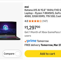 msi Katana A15 AI 15.6” 144Hz FHD Gaming Laptop$1,000Philadelphia, PA
