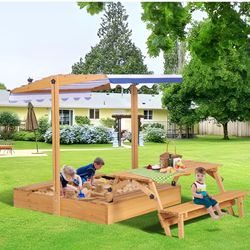 New in box Kids Sandbox with Lid, Outdoor Wooden Sand Boxes with Kids Picnic Table, Sandpit with Cover Canopy, Toddler Outdoor Playhouse with 2 Bench,$70Union, NJ