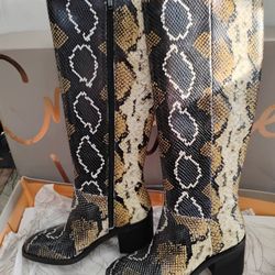 Pair of Crown Vintage Women's CV-Aressia leather snake print boots 7M Brown multi-rocky SNK printed CW $79Philadelphia, PA
