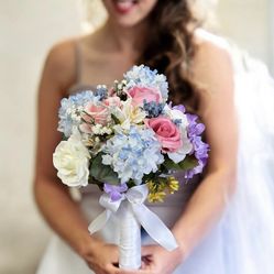 BLUSH PINK roses DUSTY BLUE hydrangea prom wedding bridesmaid bouquet$30Rockaway, NJ