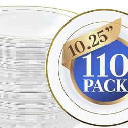 110 Pcs Plastic Dinner Plates, Disposable (10.25 inch, White w/Gold Rim) Heavy Duty Plates for Party, Elegant Dinner, Wedding, Birthday | White, Hard $30The Bronx, NY