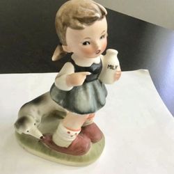 Vtg.1950s Hummel Style Figurine Girl w/ Milk Bottle + Dog Erich Stauffer $5Garden City P, NY