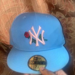 Light Blue Yankee Hat With Pink Brim and Rose Size 7 1/8$40New York, NY