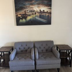 For Very Gently, Used Chairs, Light And Dark Gray,, Two End Tables Of Wood And Iron, New York Skyline Art. $200Las Vegas, NV