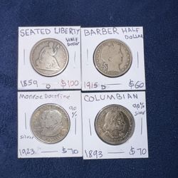 Seated Liberty,Barber, Monroe Doctrine, Colombian Half Dollar (90% silver)$300Henderson, NV