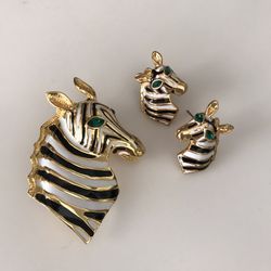 Vintage Enamel Zebra Head Green Rhinestone Eyes Brooch Pin And Earrings Gold Tone $20Henderson, NV