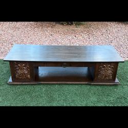 Vintage, carved panel accents mid-century wood coffee/TV table 59,5” by 23,5” in dark walnut color in great condition.$350Las Vegas, NV