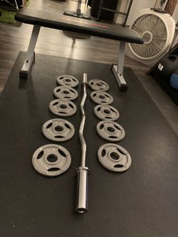 GYM LOT: OLYMPIC EZ CURL BAR, (10) 5 LB PLATES, FLAT BENCH NEW WORKOUT GYM EQUIPMENT$1Las Vegas, NV