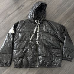 Disneyland Puffer Jacket Black Hooded Embroidered Castle Faux Leather Sz XL$115Las Vegas, NV