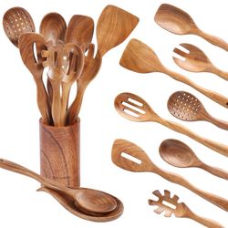 10Pcs Wooden Spoons for Cooking with Spoon Rest & Holder, 12inch Wooden Kitchen Utensil Set, Non stick, Non Scratch, Natural Teak Wooden Utensils for $20Las Vegas, NV